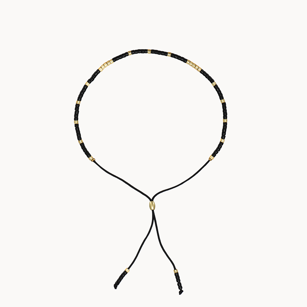 Náramek KORA BLACK je pletený šňůrkový náramek s korálky v černé a zlaté barvě. Jeho nastavitelný design zajišťuje dokonalé přizpůsobení pro každé zápěstí. Je to jemný a zároveň výrazný kousek, který krásně vynikne nejen samostatně, ale hodí se také do kombinací s dalšími náramky.