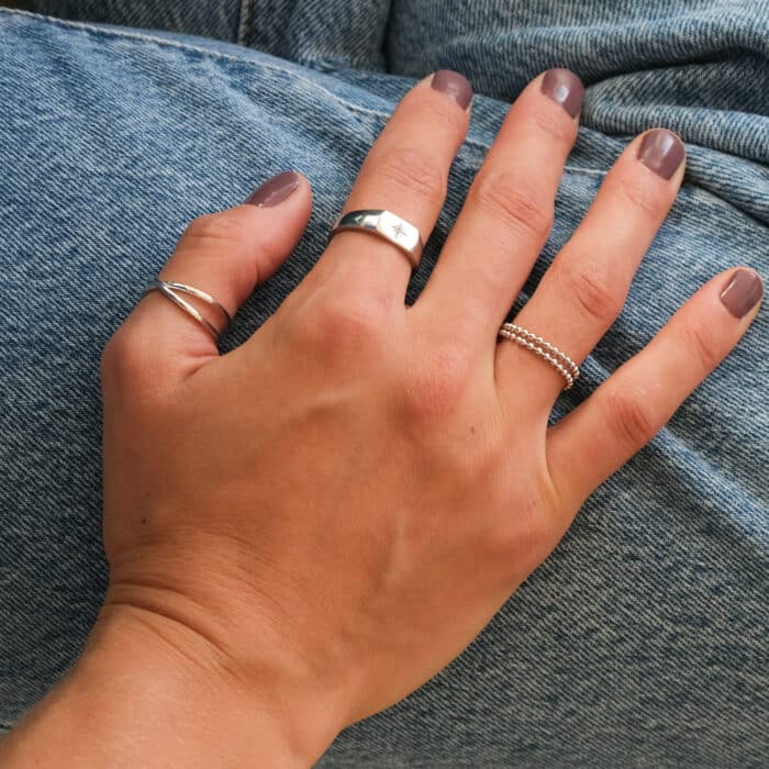 Stříbrný, rhodiovaný prsten AIR, jak už název napovídá, je vzdušný a jemný. Prsten není pevně uzavřen a lze si jej mírným stiskem přizpůsobit svým potřebám. Zajímavou volbou je také umístění prstenu AIR na váš palec.
