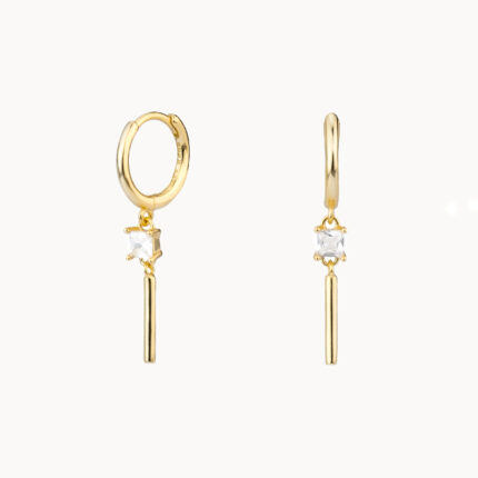 Stříbrné, 18k zlatem pozlacené, kruhové náušnice POLE jsou doplněny o visící čirý zirkon a minimalistickou hůlku. Jejich jemný a moderní design krásně zvýrazní linii krku a hodí se pro každodenní nošení i speciální příležitosti.