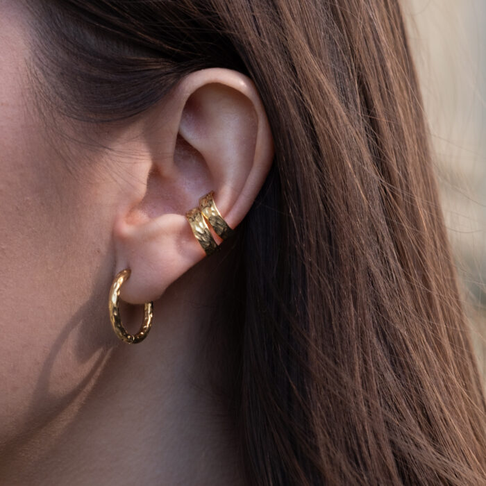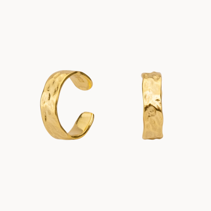 Stříbrný, rhodiovaný, 18k pozlacený earcuff LORA je dokonalou volbou pro každou ženu, která chce zvýraznit své ucho stylovou náušnicí bez nutnosti propíchnutí ucha. Earcuff LORA má jedinečný design, připomínající zmačkaný papír, což jej činí unikátním, designovým doplňkem. Earcuff se jednoduše umístí na požadovanou část ucha a v případě potřeby jemným přitlačením zafixuje.