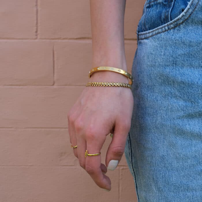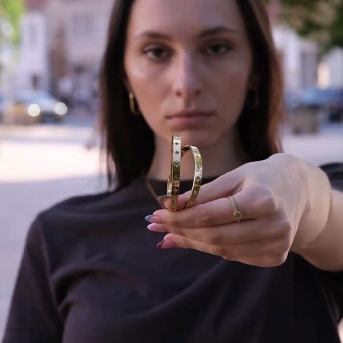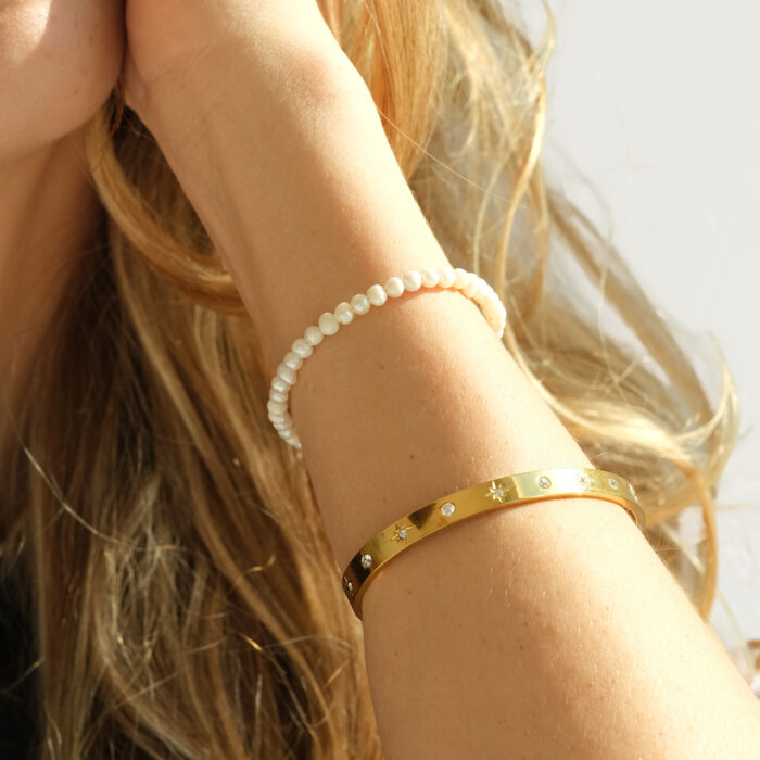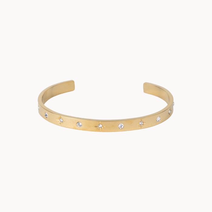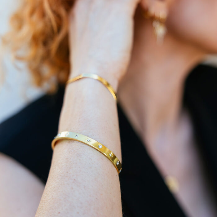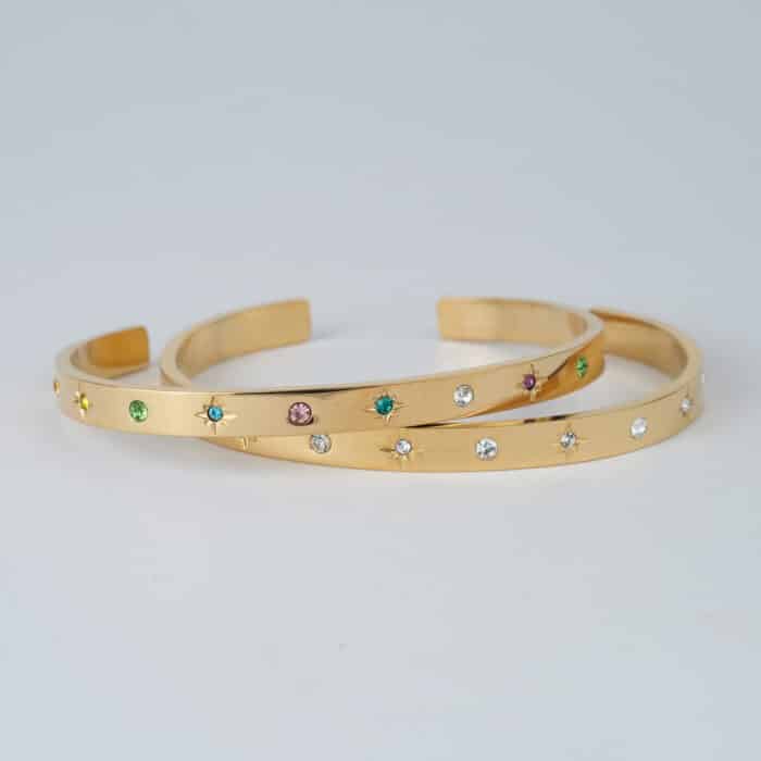 Náramek ZETA je vyroben hypoalergenní, chirurgické oceli, pozlacený 18k zlatem. Je doplněn o čiré zirkony po obvodu. i koupat či sprchovat, aniž byste jej museli dávat dolů. Náramek ZETA si snadno přizpůsobíte velikosti své ruky, tak že jej jemně stlačíte nebo roztáhnete iv provedení s barevnými zirkony.