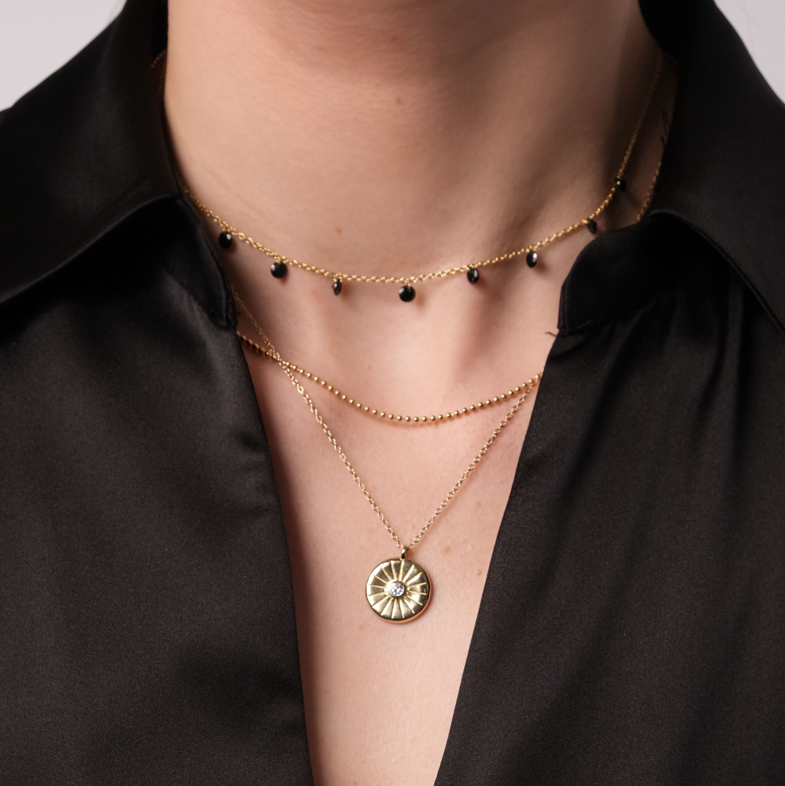 Stříbrný náhrdelník GALAXY s 18karátovým pozlacením je zvýrazněn kruhovým medailonem s malým zirkonem uprostřed. Nejkratší délka náhrdelníku je 38 cm a díky přídavnému koncovému řetízku jej můžete prodloužit až na 46 cm.