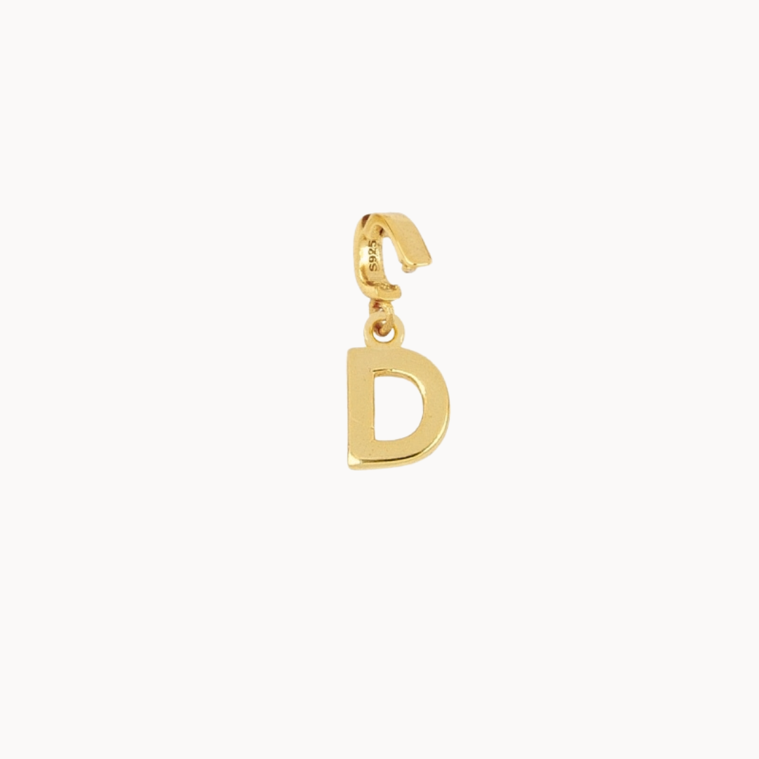 Elegantní přívěsek ve tvaru písmene D, vyrobený ze stříbra, pozlacený 18k zlatem, je jemným detailem s osobním významem. Minimalistický design a kompaktní velikost přibližně 9 mm z něj činí ideální doplněk pro každodenní nošení i vrstvení.